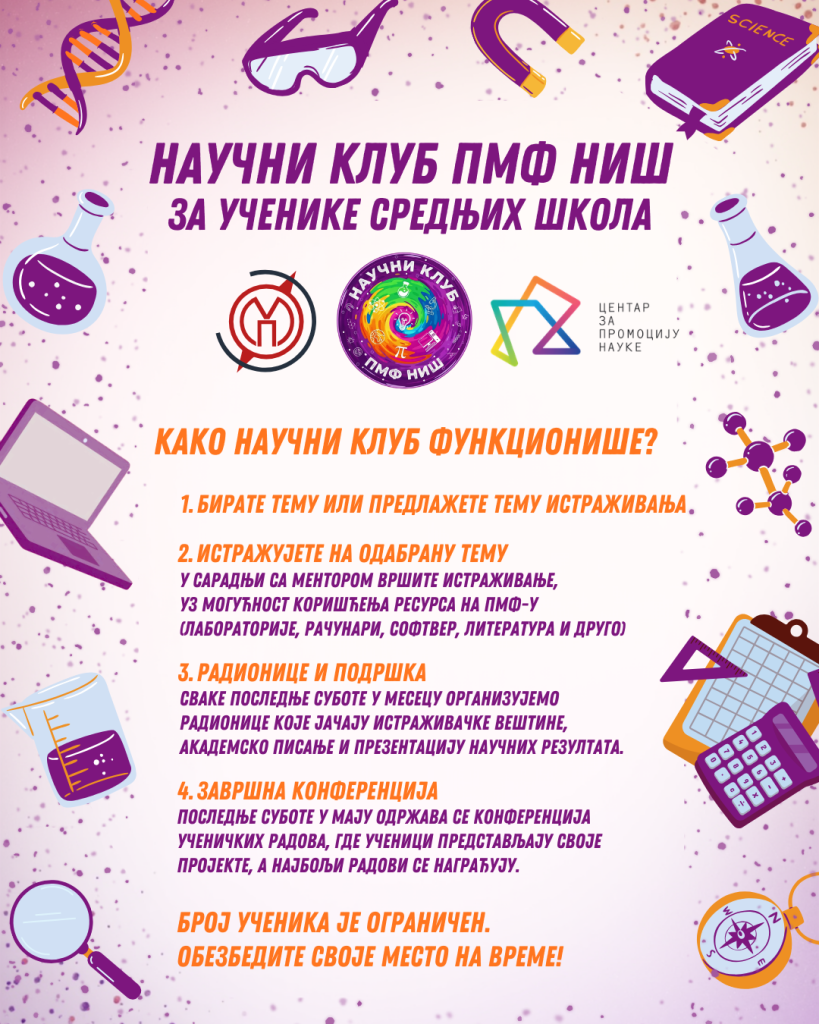 - Сви заинтересовани учесници средњих школа до 28. фебруара 2026. године могу да одаберу једну од понуђених истраживачких тема и тиме се региструју за учешће у Научном клубу